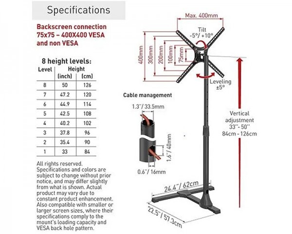 - VESA 100mm x 100mm, VESA 200mm x 200mm, VESA 75mm x 75mm, VESA 400mm x 400mm, VESA 400mm x 200mm, VESA 200mm x 100mm, VESA 400mm x 300mm, VESA 100mm x 200mm, VESA 300mm x 400mm, VESA 200mm x 300mm
