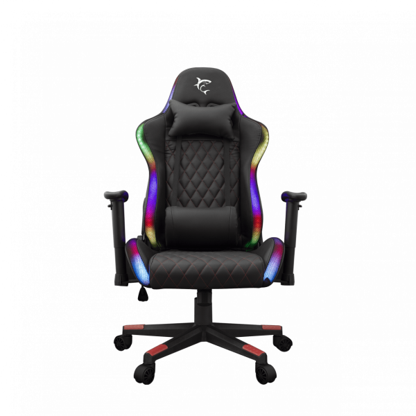 WHITE SHARK THUNDERBOLT Black RGB, Vrsta stolice: Gaming stolica, Naslon za ruke podesiv: 2D; Podesavanje nagiba: 180 stepeni; Zakljucavanje nagiba: Da; Zakljucavanje ugla nagiba: Da; Podesavanje lumbalnog dela: Da, Orginalna sundjer za naslon, hladno presovan sundjer za sediste, Osvetljenjen RGB (Napajanje samog LED osvetljenja vrsi se putem klasicnog USB konektora ili prenosne baterije (power bank) koja nije ukljucena u pakovanju proizvoda - Napajanje osvjetljenja: 5V ), Tip postolja: 350mm plasticna baza; Velicina tockica i materijal: 60mm PU; Dimenzija povrsine sedenja: 52 cm x 54 cm, Dimenzija naslona: 56 cm x 84 cm, Visina sedista: 46.5 cm - 54 cm, Boja okvira: Crna; Materijal okvira: celik; Boja presvlake stolice: Crna sa crvenim stepom; Materijal presvlake stolice: PU koza; Maksimalna nosivost: 150 kg